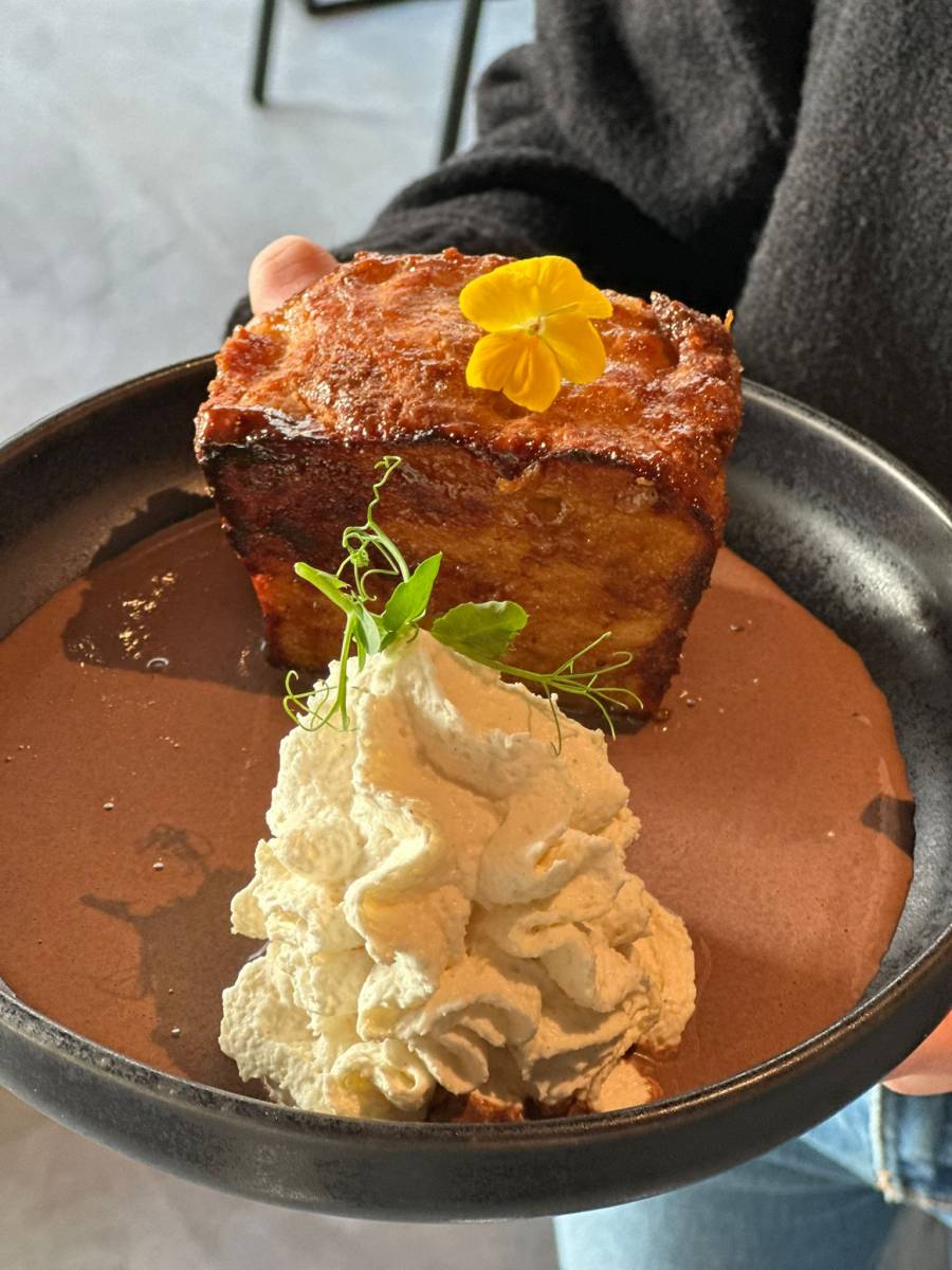 Succulent BANANA BREAD servi tiède avec un fouetté de peanut butter et une sauce cacao .
