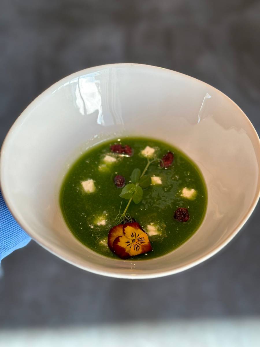 Brass and Co vous propose une entrée tout en couleur et saveur: un velouté glacé de concombre avec feta et cranberries.