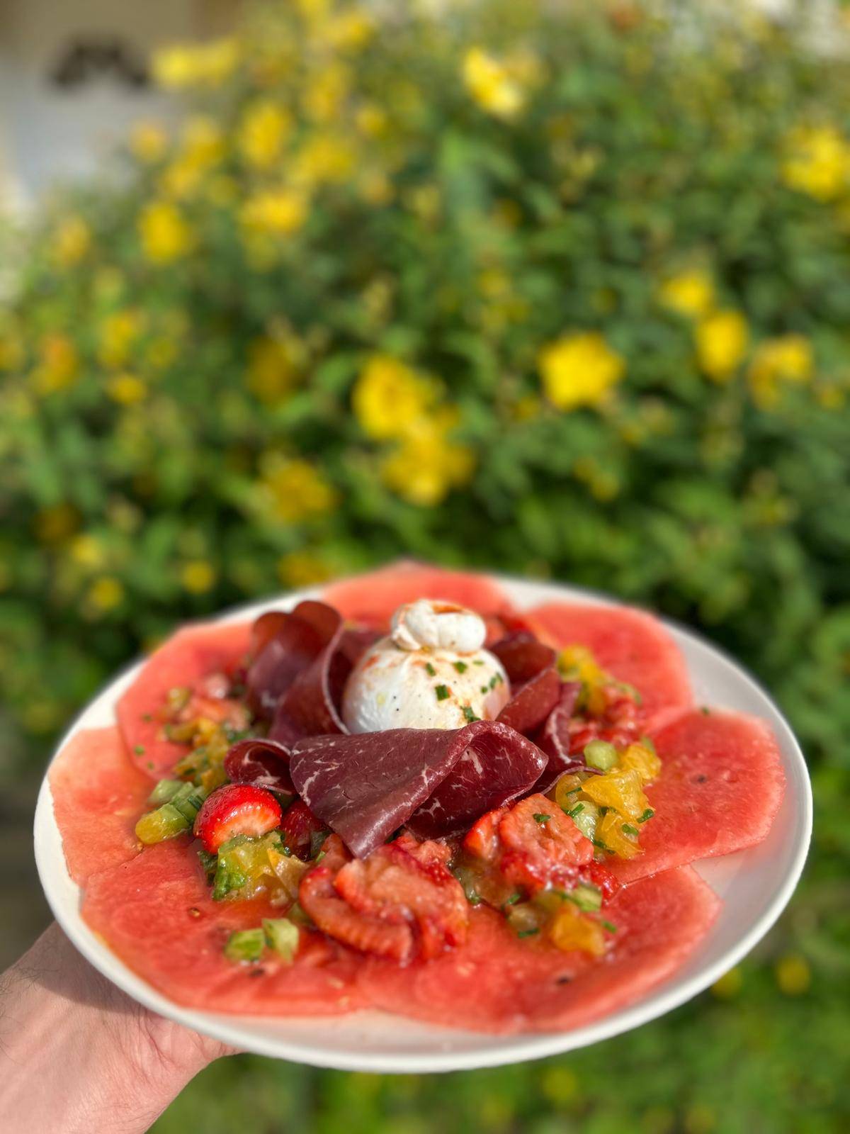 C’est un carpaccio de pastèque avec une burrata crémeuse et de la tomate verte, le tout assaisonné avec une vinaigrette fraise… Un régal