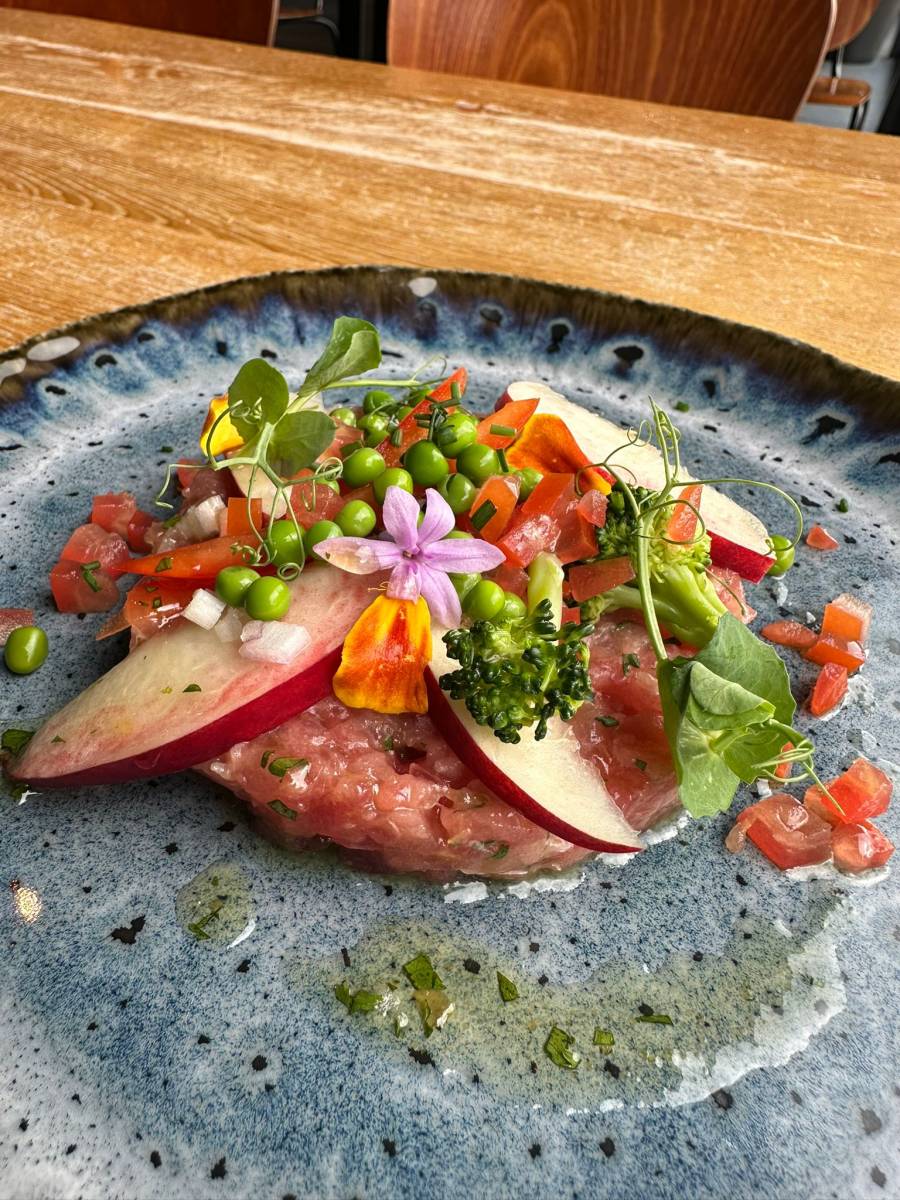 C’est un tartare de thon, tomate, poivron, coriandre, nectarine, petit pois, brocoli… un régal!!